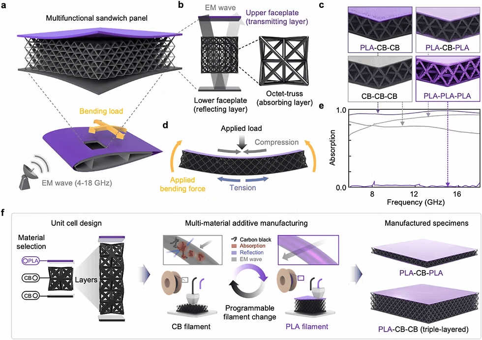 - Single-step multi-material 3D printing manufactures MMSC using octet-truss core.