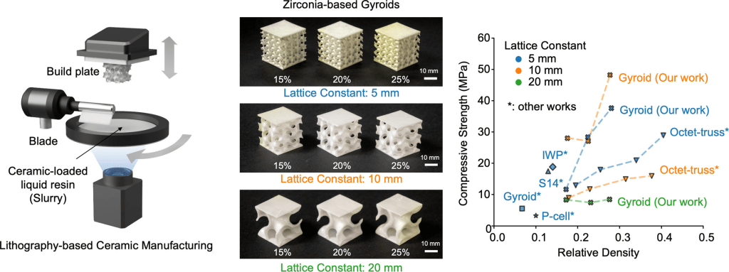 By using gyroid geometry, we 3D printed ceramic-based (zirconia) fracture-resistant geometry under low relative density.